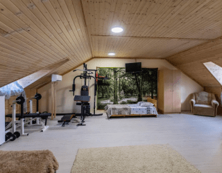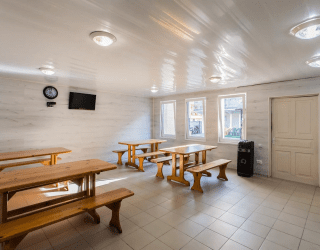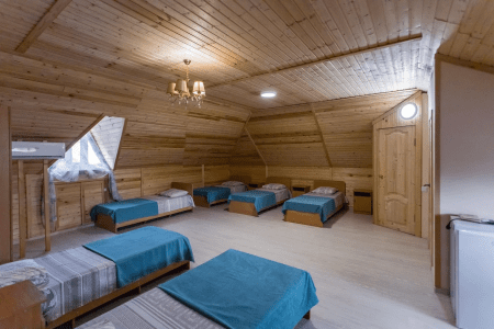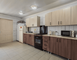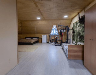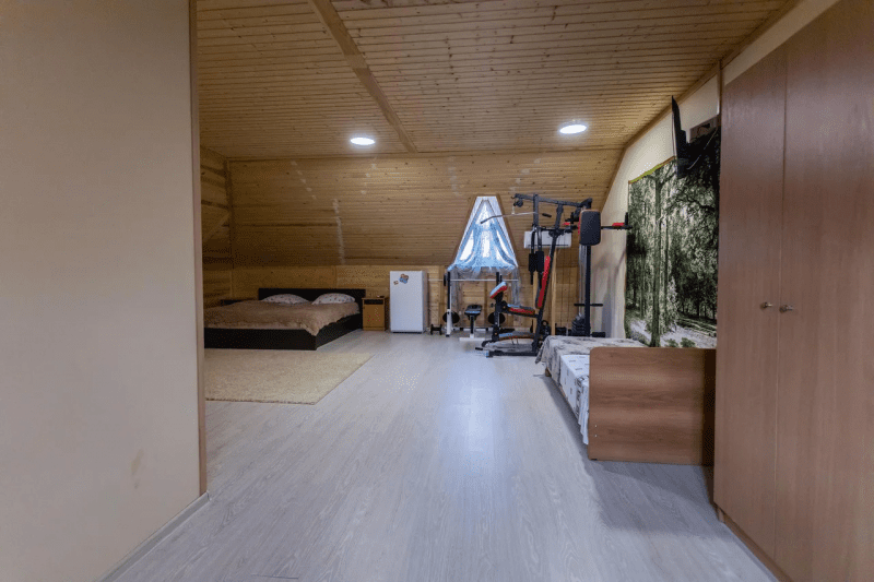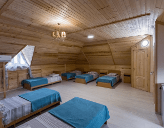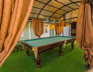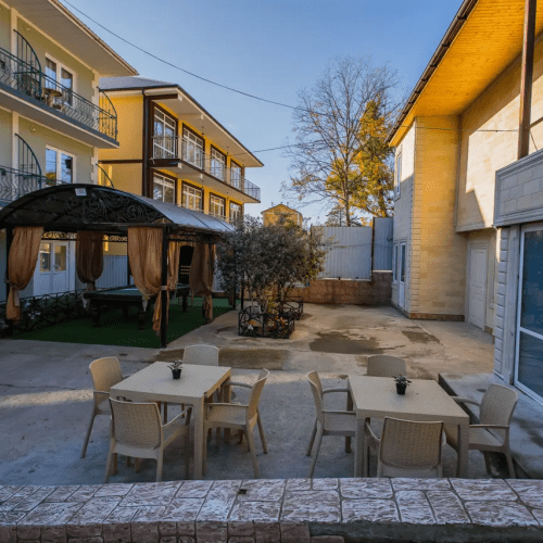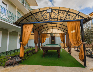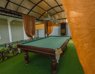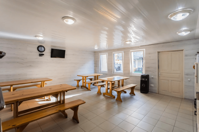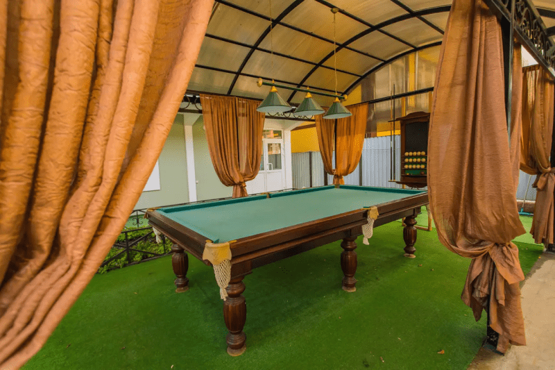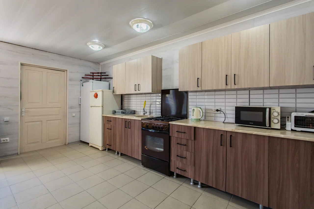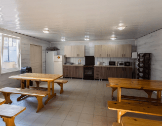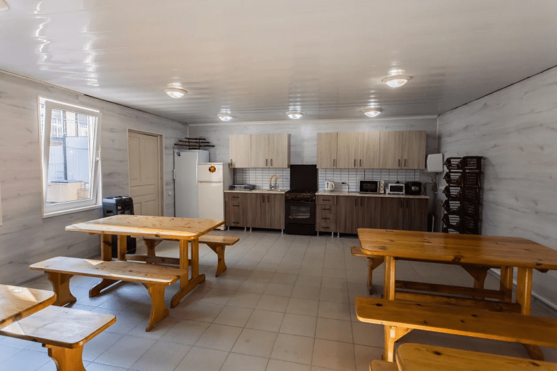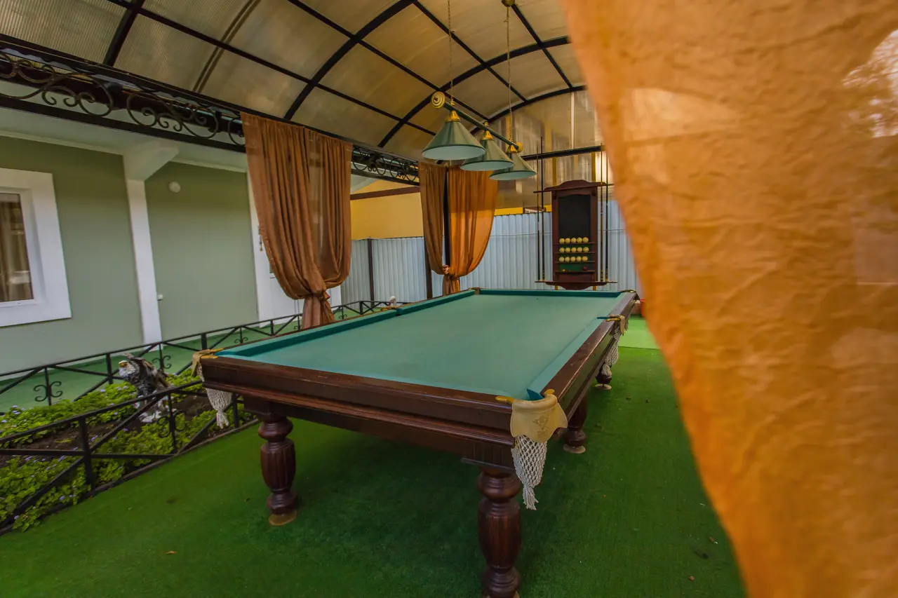 В распоряжении гостей предоставляется общая кухня с бытовыми приборами и обеденной зоной. Для маленьких гостей на территории есть открытый бассейн. Для комфортного времяпрепровождения есть беседка, зона барбекю, где можно приготовить мясо или овощи на мангале, баня, бильярд. Для удобства гостей предусмотрена парковка для автовладельцев с круглосуточным видео наблюдением. На территории гостевого дома есть своя детская игровая зона.